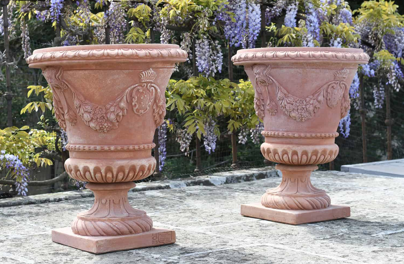 Large Medici-style vase with base decorated in a classical style with pearls and ornamental cords; furthermore two heads of satyrs and two Medici coats of arms intersperse festoons of flowers and fruit. Of excellent durability, the shape remains unchanged over time, but becomes even more beautiful when inevitably lichens settle on the surface and age it naturally. This kind of style with base, for the most part, should be positioned on pillars or columns, steps or perimeter walls of gardens in order to enjoy all their slender silhouette.